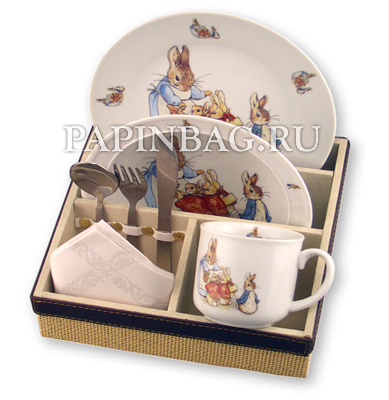 Набор детской столовой посуды "Кролик Питер" изготовлен из фарфора.